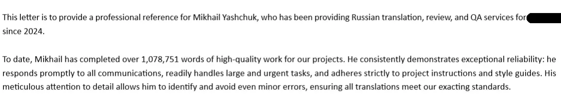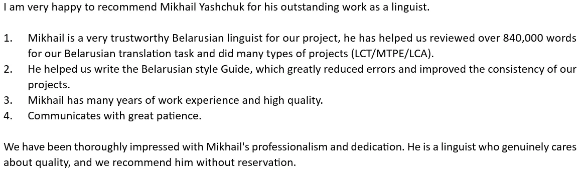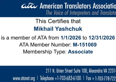 Continuing professional development is crucial for translators. Taking courses, being certified as a sworn translator by the Belarusian Notary Chamber, and holding membership in the American Translators Association allow me to expand my knowledge, refine my skills, and keep up with the industry’s best practices.